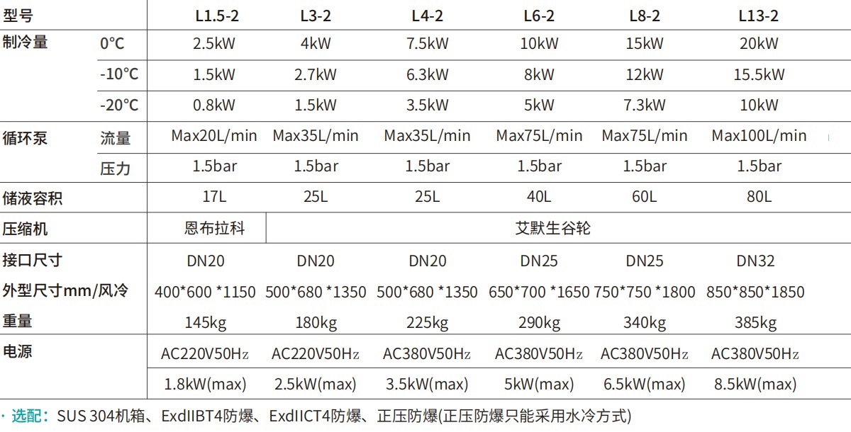 型號制冷量循環泵儲液容積壓縮機接口尺寸外型尺寸mm/風冷重量電源